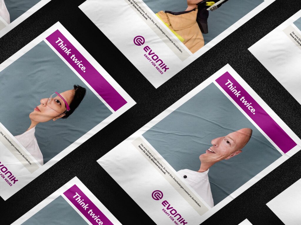 Von der Sicherheits-Abteilung von Evonik beauftragt haben wir eine Kampagne entwickelt, die spielerisch auf das Thema Achtsamkeit und Arbeitsschutz im Unternehmen aufmerksam machen soll. Der Claim “Think Twice” wurde von uns von einer deutschen Evonik-Führungskraft abgeleitet. Part Award…
