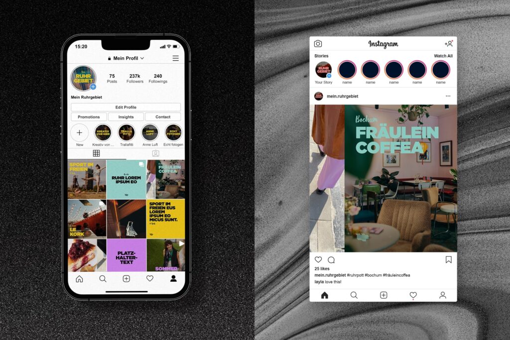 Ruhr Tourismus stellt vor, was das Ruhrgebiet zu bieten hat. Wir haben dafür ein Social Media Konzept entwickelt – abgestimmt auf die expeditive Zielgruppe. Es basiert auf einem Designsystem, das zwei Bildebenen eint: Mithilfe eines Split-Screens oder der Ruhrgebietsmaske können verschiedene Perspektiven aufgezeigt, Neugier geweckt und mehr Informationen vermittelt werden. Die neue Hierarchisierung der bestehenden Corporate-Schriften sorgt dabei nicht nur für bessere Lesbarkeit, sondern auch für einen modernen auffälligen Look.
